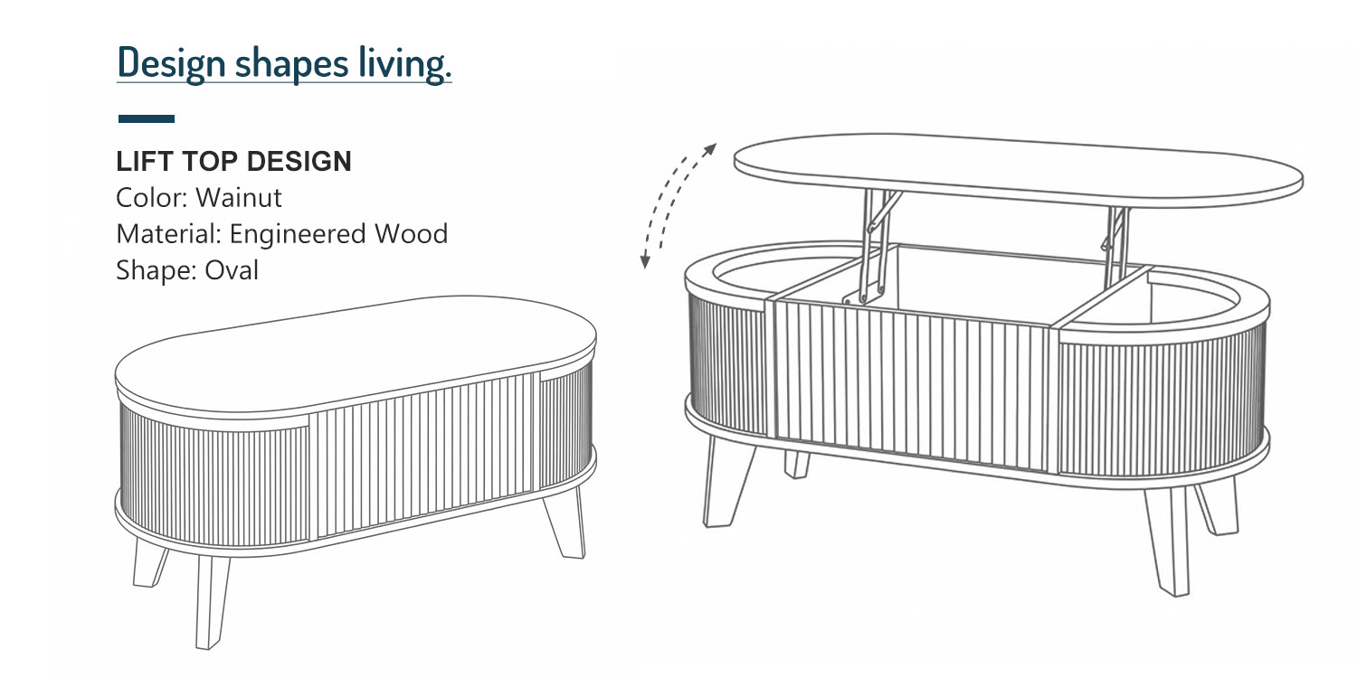 Guided by the belief that form should follow both beauty and practicality, this coffee table is shaped around the sculptural elegance of fluted geometry. The lift-top mechanism transforms the table into a flexible workspace, supported by a smooth hydraulic system engineered for comfort and stability.