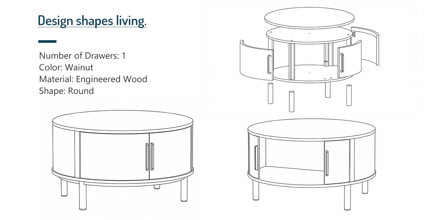 Thoughtfully engineered for contemporary living, the table integrates smooth sliding doors and concealed storage, balancing sculptural beauty with everyday functionality. The warm walnut finish highlights natural wood grain variations, making each piece subtly unique—an expression of refined taste and individuality.