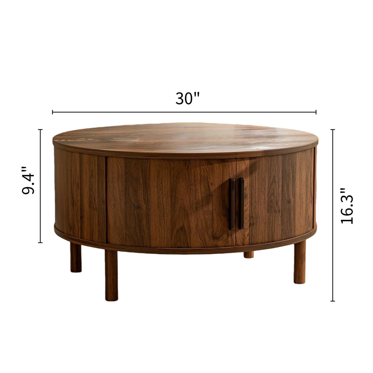 Modern Walnut Round Coffee Table with Fluted Design & Sliding-Door Storage -Walnut